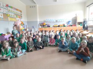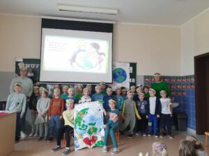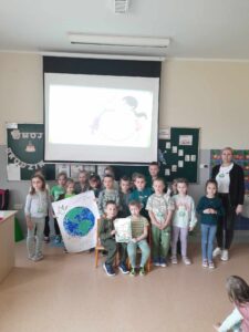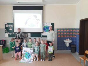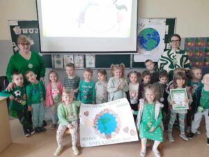 Dnia 22.04.2024 r. w przedszkolu obchodziliśmy „Międzynarodowy Dzień Ziemi”. Przedszkolaki obejrzały film edukacyjny, odgadywały zagadki związane z segregacją śmieci. Dowiedziały się, jak ważne jest dbanie o przyrodę. Śpiewały piosenki o tematyce ekologicznej. Każda grupa wykonała plakat pod hasłem: „Nasza Ziemia- naszym domem, dbajmy o nią każdego dnia!” ,za który otrzymała dyplom. Za udział w konkursie oraz aktywność i zaangażowanie każde dziecko otrzymało medal „Przyjaciela Ziemi” oraz słodki upominek. Obchody „Święta Ziemi” zostały zakończone akcją sprzątania terenu boiska.